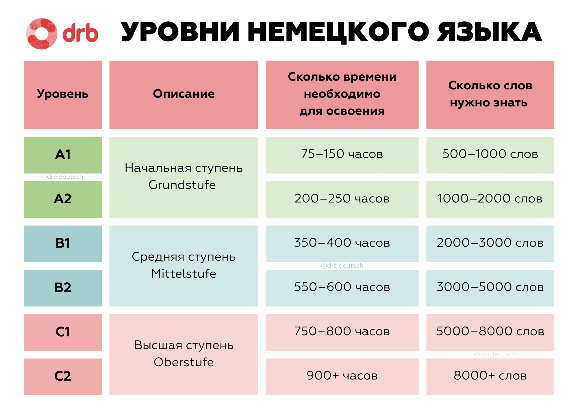 Итак, давайте подробнее рассмотрим, что включает в себя каждый из шести уровней немецкого языка.
